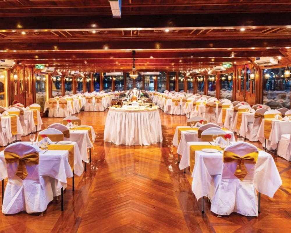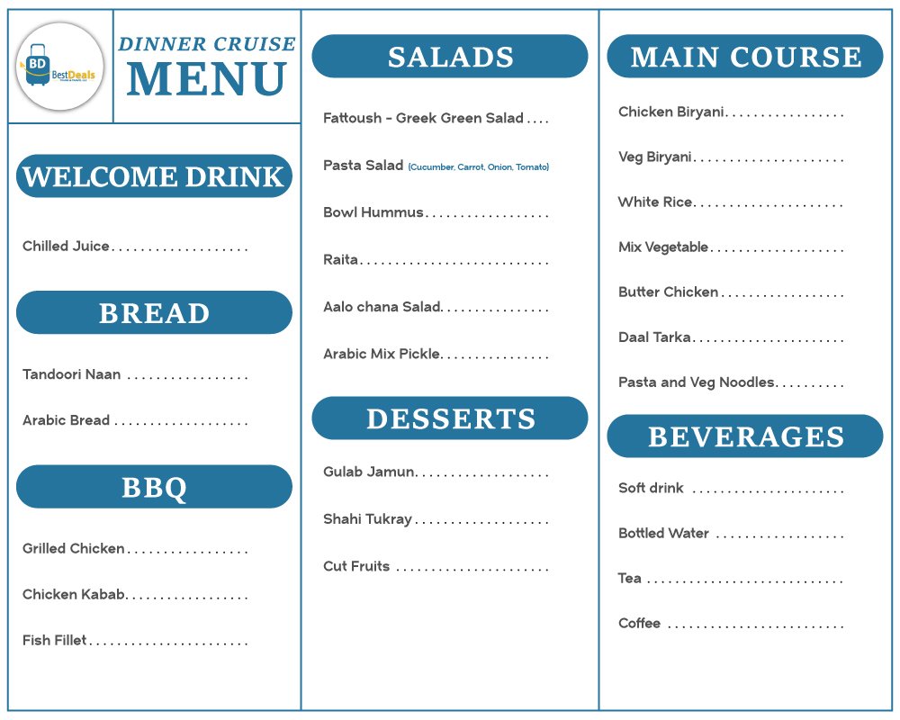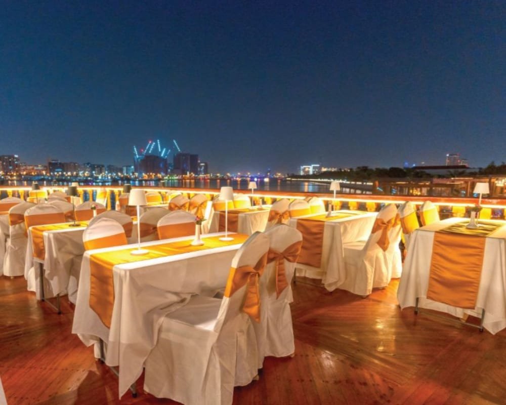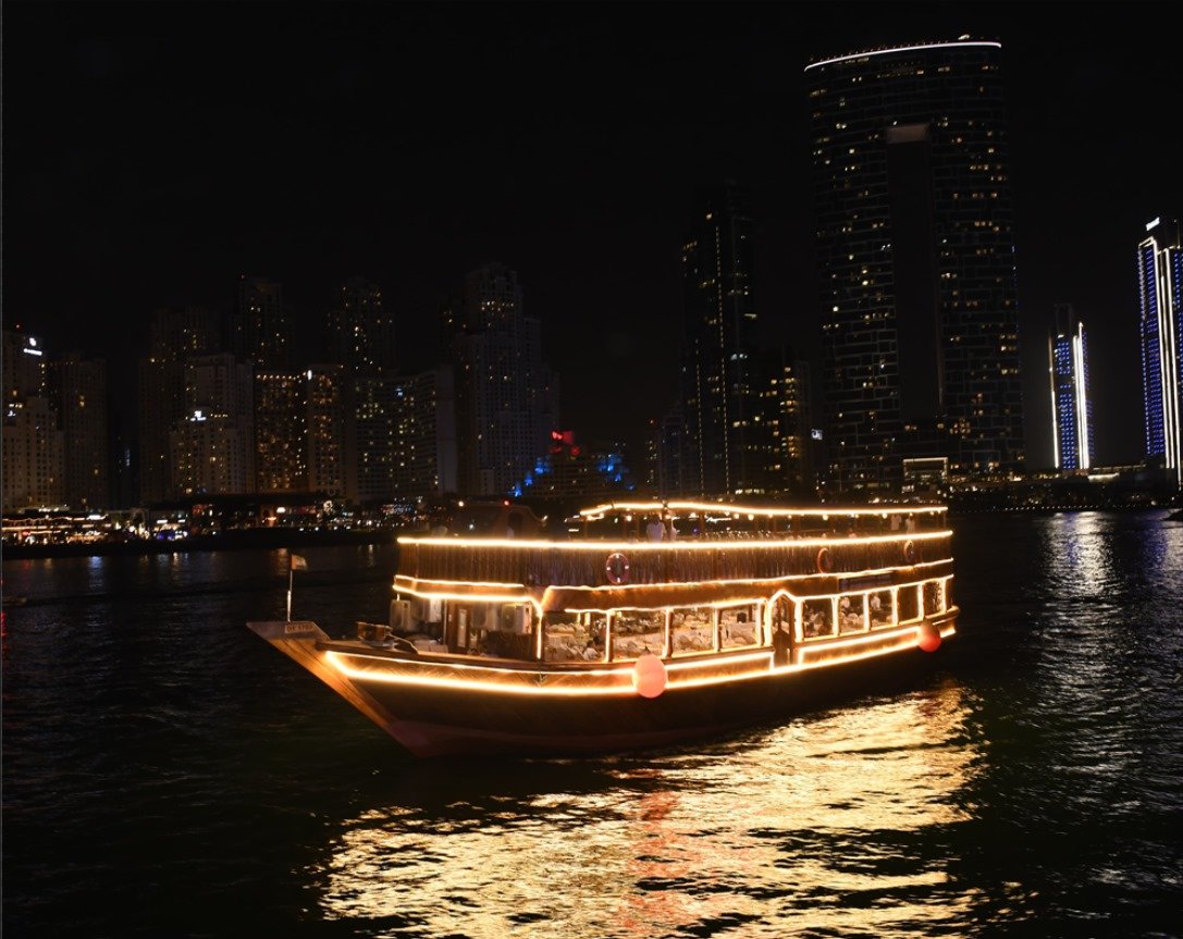 Enjoy a serene dinner experience as you sail along the historic waters of Dubai Creek. This traditional-style evening cruise offers a blend of culture, comfort, and culinary delight. As the vessel glides past Al Seef’s charming architecture, heritage-style buildings, and waterfront views, guests can relax, dine, and immerse themselves in the tranquil ambiance of old and new Dubai.