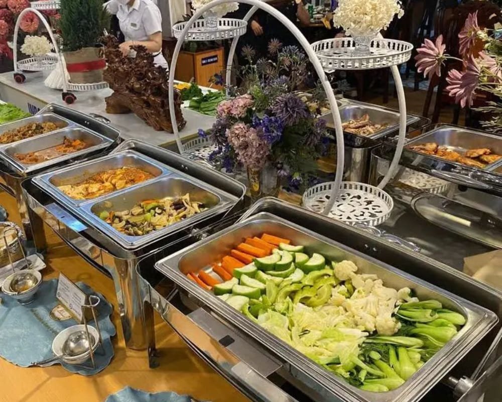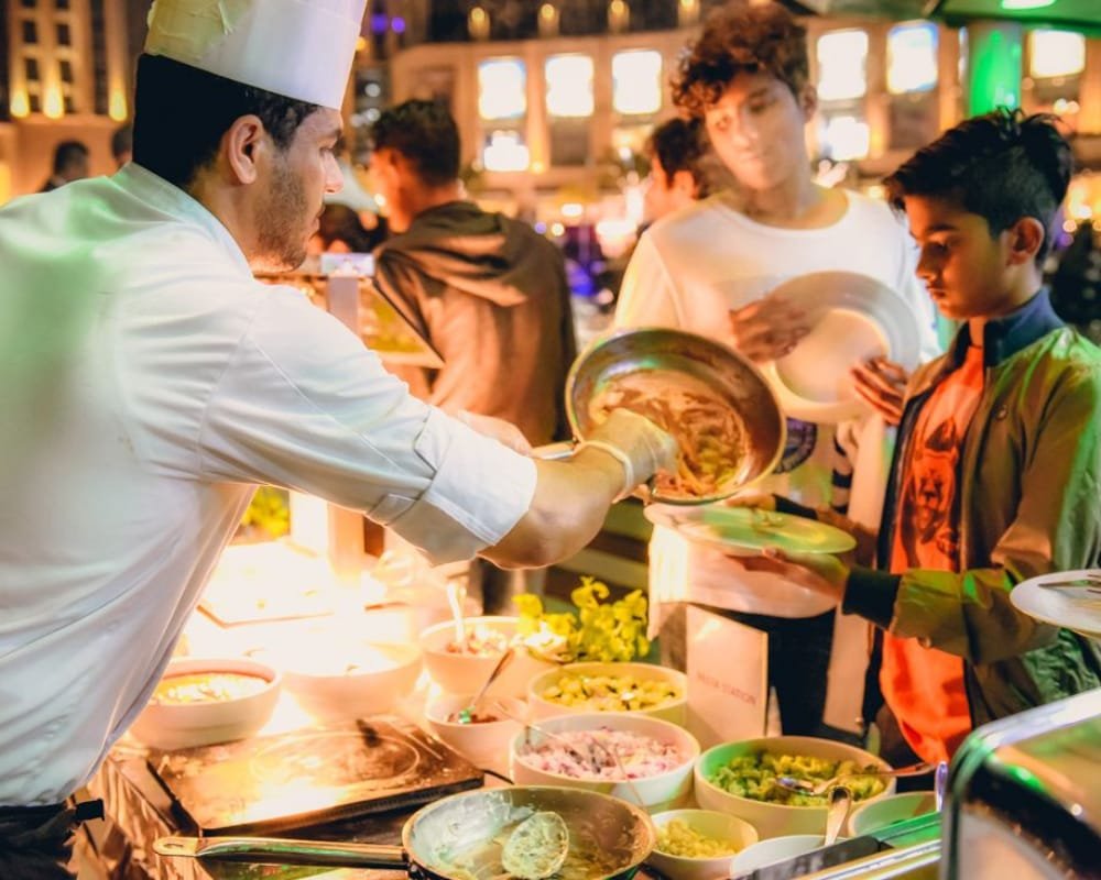 Gourmet international buffet with live cooking stations